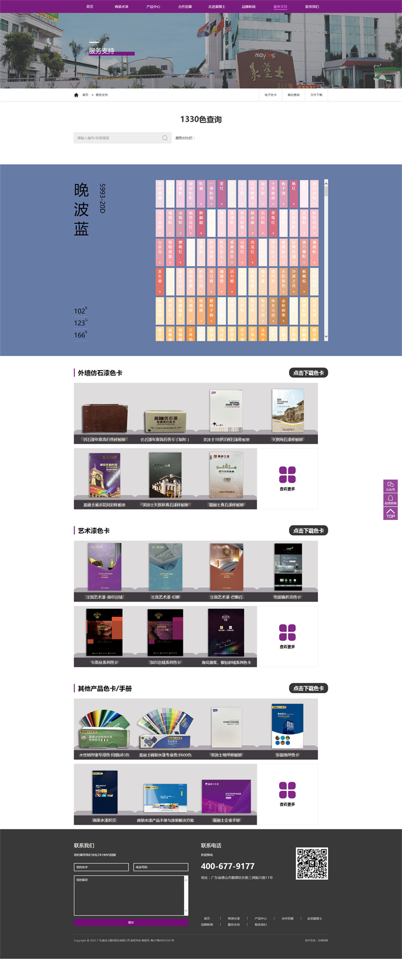 另外,為了方便各位用戶更快捷地了解我們的產品信息,新官網(wǎng)特別推出了電子色卡系統(tǒng)。在這里,用戶只需輸入產品的編號和名稱就可以查詢到對應的顏色。同時,我們還提供了外墻仿石漆、藝術漆、商裝水漆等核心產品色卡和手冊供用戶下載。