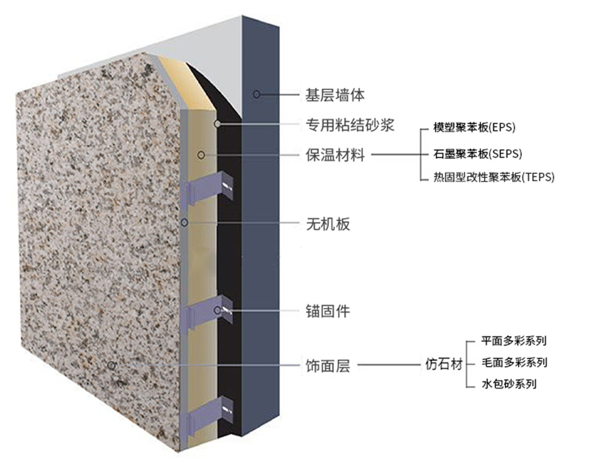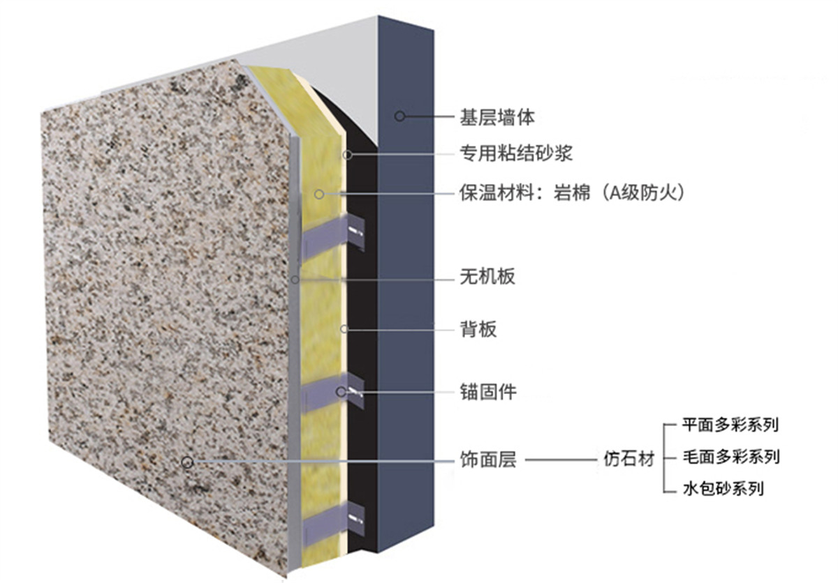 無機(jī)板類多彩仿石保溫裝飾一體板選用高密度、高強(qiáng)度A1級(jí)無機(jī)板為基材,通過精砂、滲透封閉、界面處理、飾面噴涂(輥涂)、固化、養(yǎng)護(hù)、復(fù)合等多道現(xiàn)代化生產(chǎn)工序加工成型。