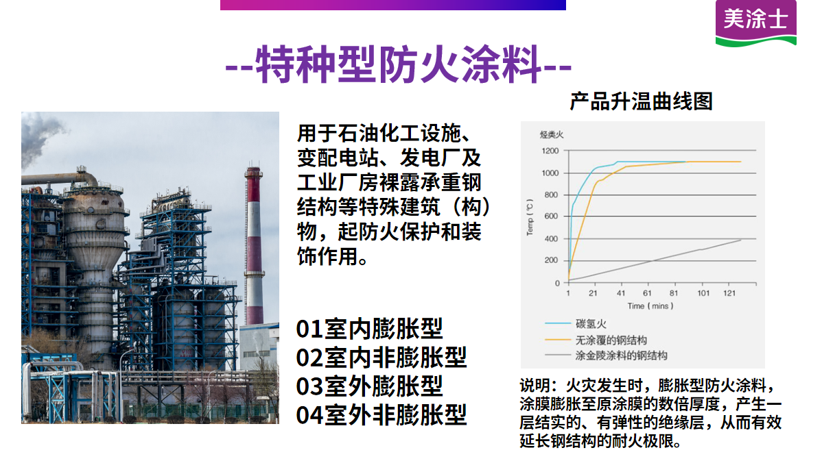 適用特殊建筑物(如石油化工設(shè)備、變配電站等)室內(nèi)鋼結(jié)構(gòu)表面的防火保護。
